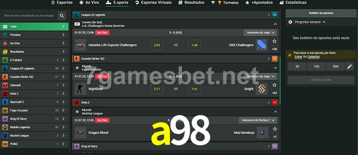 O a98 oferece uma grande seleção de opções de apostas em e-sports com probabilidades competitivas